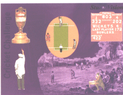 Reviews This appeared in a local UAE paper and was kindly sent in by Imran Ali. Cricket Challenge, the new cricket CD-ROM game and Quiz from Anil Kumble's Googly series of Multimedia based cricket simulation software by Stump Vision has been launched in the UAE. Cricket Challenge is a powerful,attractive and interactive visual package on Windows that turns a PC into a playing field.Ideal for people of all ages, whether one is just having fun or having a serious game of cricket, this latest product allows users to play one-off matches between any two international teams or a tournament of one's choice. One can even replay the ongoing Carlton & United Series in Australia or play the Triangular Sharjah Cup to be held in April this year. Cricket Challenge enables you to setup a tournament of your choice in any format and any number of tournaments can be played at one time.One can even have a "Dream Team" of World XI battling against another "Dream Team" of one's choice. There's an exhaustive player database of 650 international players and a choice of 55 cricket grounds - from Lords to Sharjah to Toronto, backed by a realistic simulation engine culminating in a variety of interesting outcomes. Other feature's include complete statistics of the game, ability to save scorecards and a novel and innovative facility to include 12 members in a team - one designated as a batsman and another only as a bowler. Video Comments by record setter Anil Kumble on the match and the man-of-the-match, realistic crowd scenes and expert audio commentary by Anil Kumble and a ground/pitch report. The Cricket Quiz contains well over 5000 questions grouped in 5 playing levels consisting of Video questions by Anil Kumble, jigsaw type teasers to test and improve a person's cricketing knowledge etc. Downloads Feedback Send feedback about Anil Kumble's Googly Cricket Challenge. Hints Cheats Links Anil Kumble's Googly Products. Screenshots |